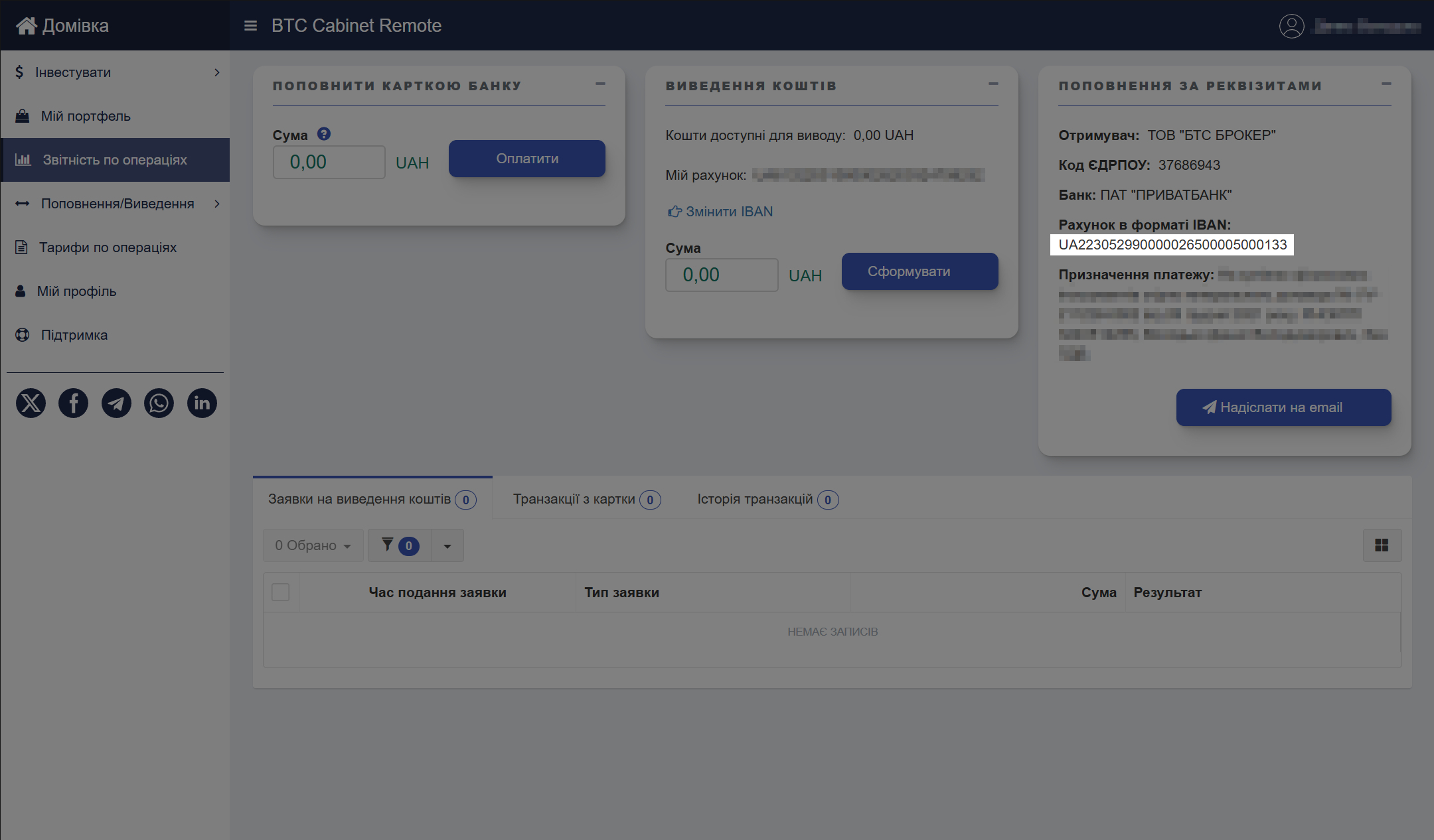 Щоб поповнити інвестиційний рахунок за допомогою IBAN, скористайтесь блоком Поповнення за реквізитами.