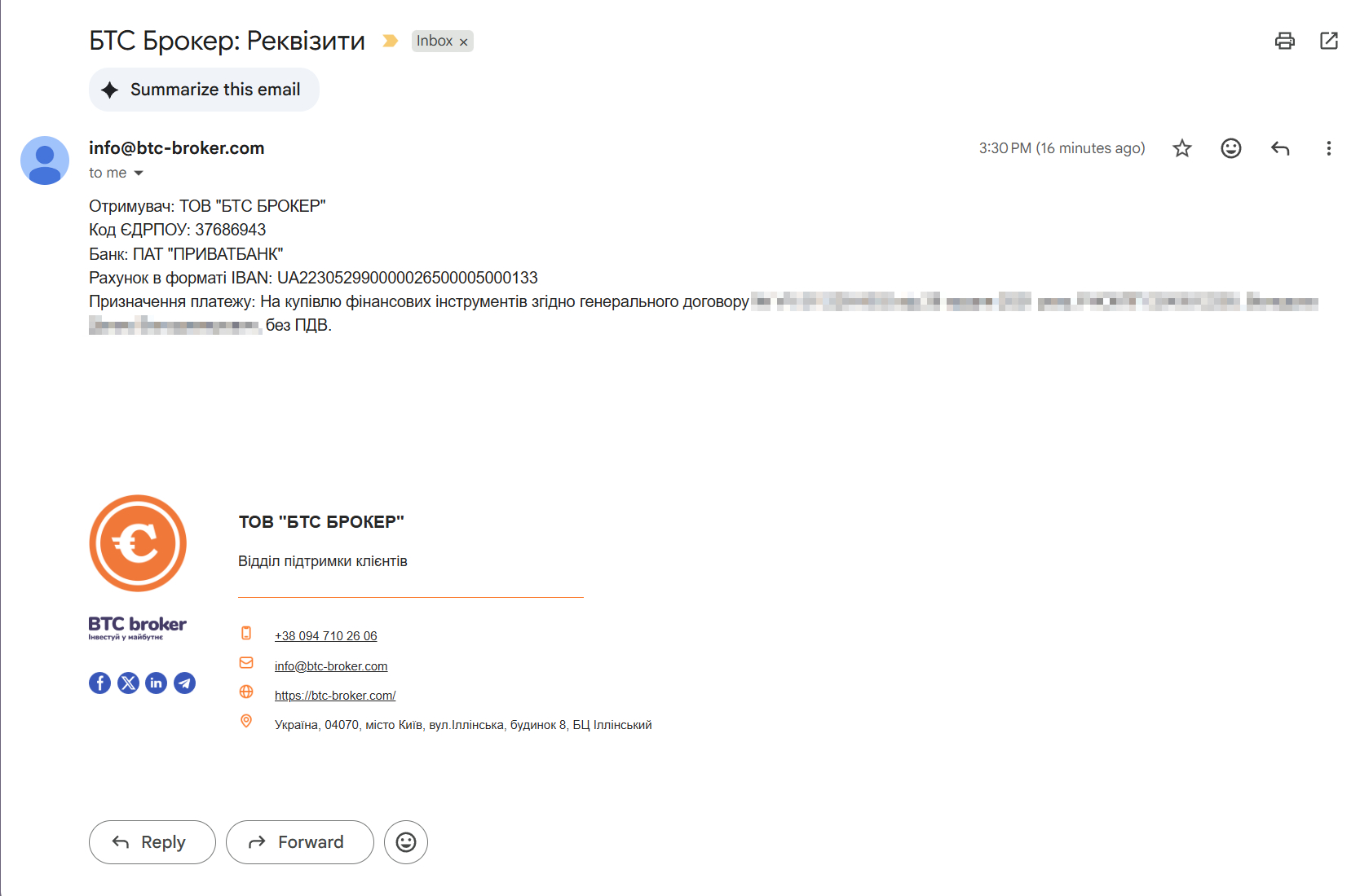 Протягом хвилини вам надійте лист з детальними реквізитами для поповнення інвестиційного рахунку