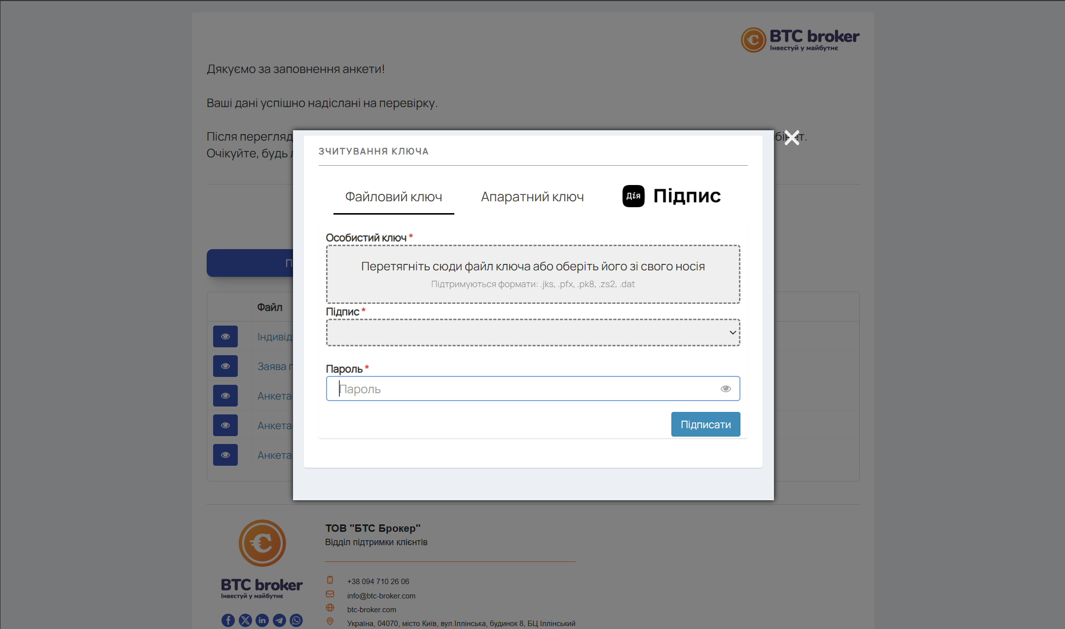 Щоб підписати документи через ЕЦП, оберіть вкладку "Файловий ключ", перетягніть, або оберіть файл на вашому комп'ютері, введіть пароль від ЕЦП та натисніть Підписати