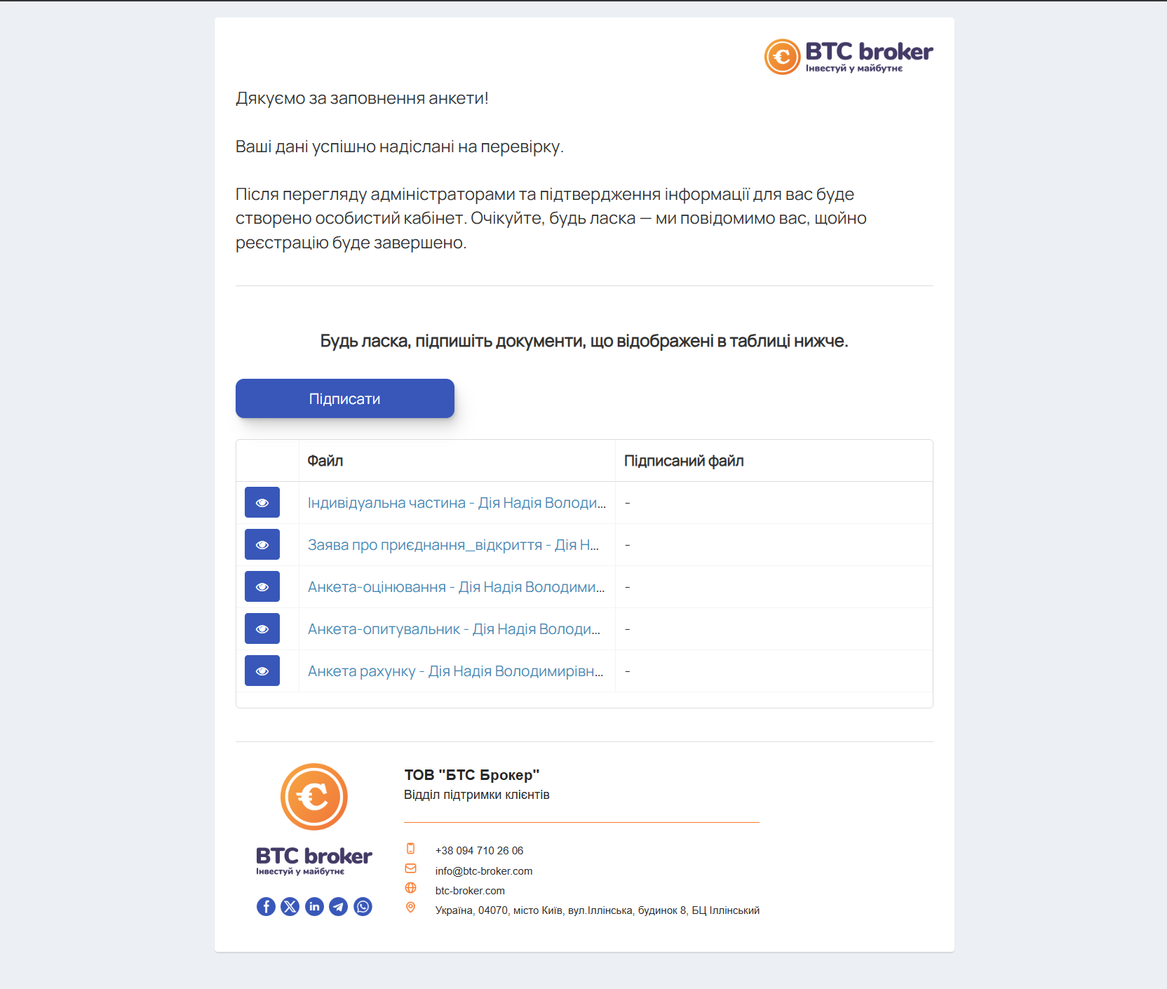 Останнім кроком в процесі реєстрації є крок підпису документів. Вам надійде електронний лист на ємейл з посиланням на вікно підпису документів. Після того як ви отримали цього листа, ви можете перейти по посиланню в листі, або просто оновити сторінку Кабінета Інвестора